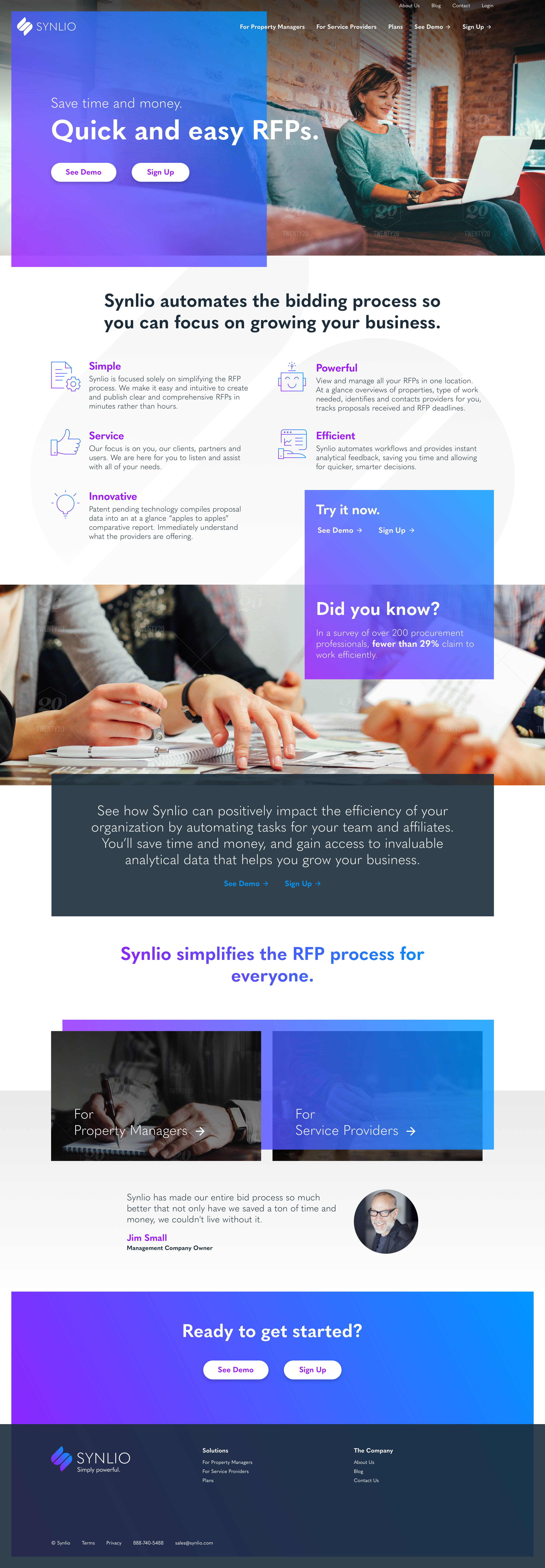 Synlio is software that automates and simplifies the RFP process. The company was in need of a logo and marketing site after a recent renaming. I designed the new visual identity, and the marketing site and product updates are on-going efforts. Here's a sneak peek of Synlio's new look, with more to come soon.